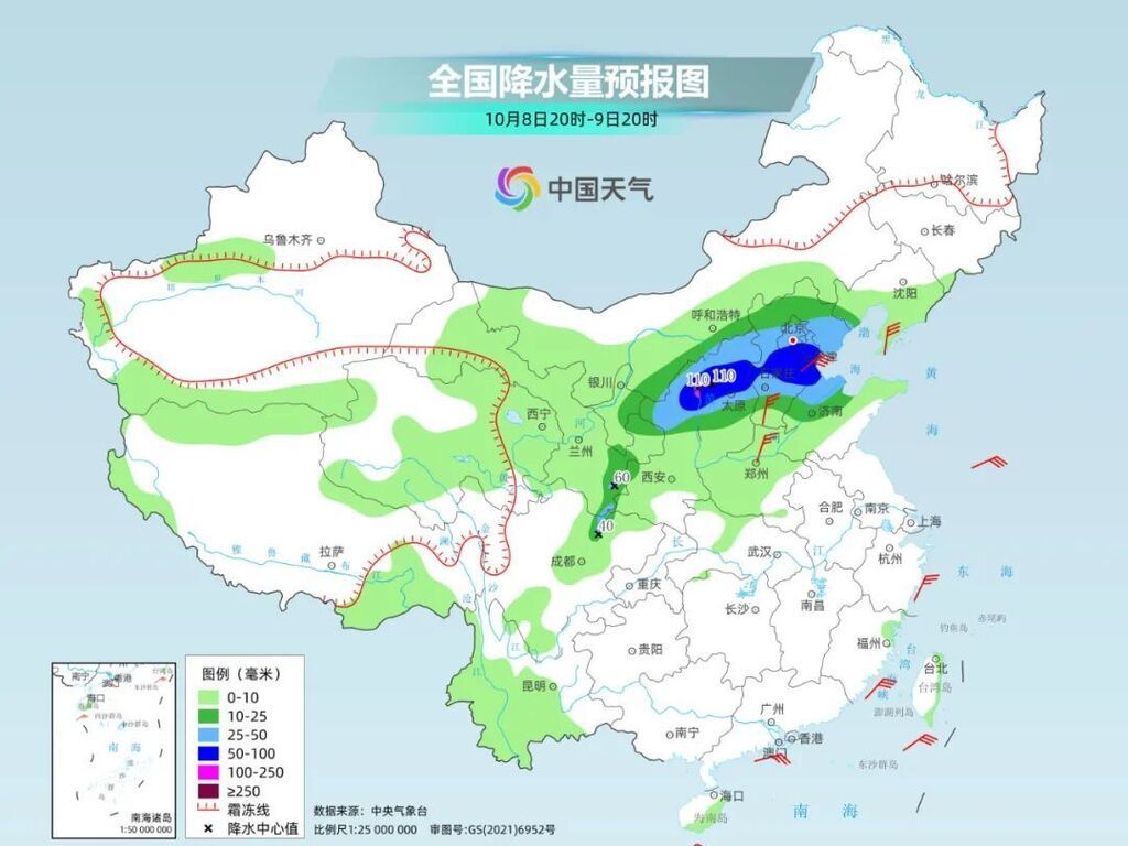 明天夜间到后天,甘肃南部、宁夏东部、陕西中北部和西南部、内蒙古河套地区、山西中北部、河北中南部、北京南部、天津中南部、山东北部、辽东半岛等地部分地区有中到大雨,其中,山西中部、河北中部等地局部地区有暴雨。