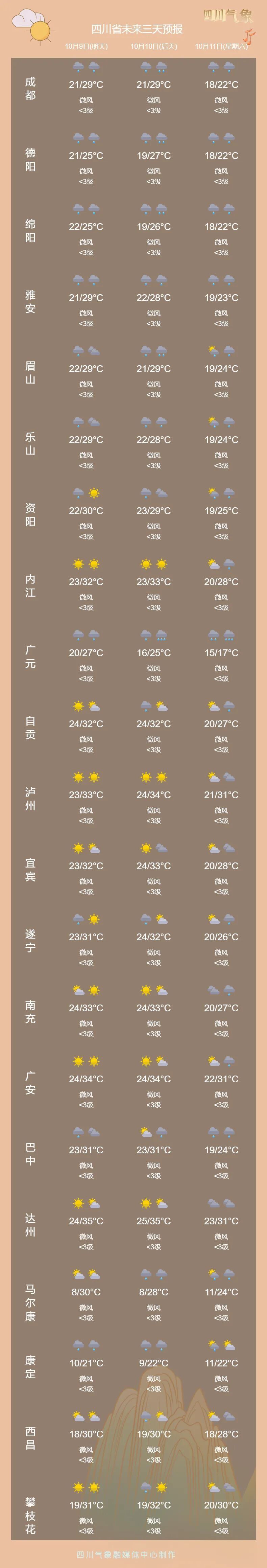 据中央气象台和四川省气象台预报,未来10天,四川盆地仍多降雨天气,降雨量较常年同期明显偏多,降雨时段主要集中在10日至13日。预计10月11日至13日,四川全省有一次较强降温降水天气过程,盆地日平均气温将累计下降4~7℃,局部下降8℃或以上;冷空气影响时有4~6级偏北风,局部7级或以上;雨量普遍小到中雨,其中广元、绵阳、德阳、巴中、达州、广安、南充、遂宁、资阳9市的部分地方有大雨到暴雨,局部大暴雨;川西高原和攀西地区小雨,局部中雨,气温下降2~4℃。