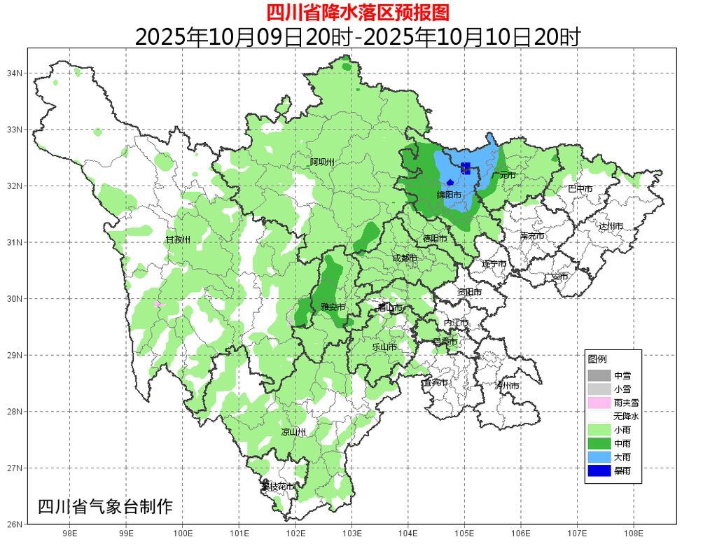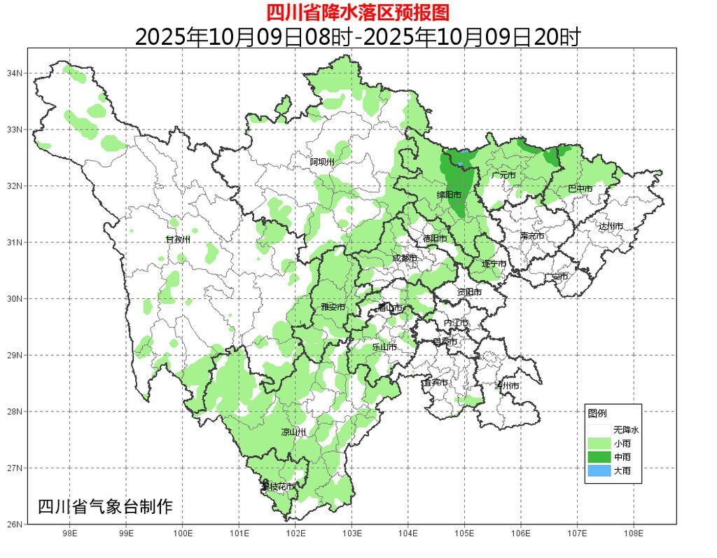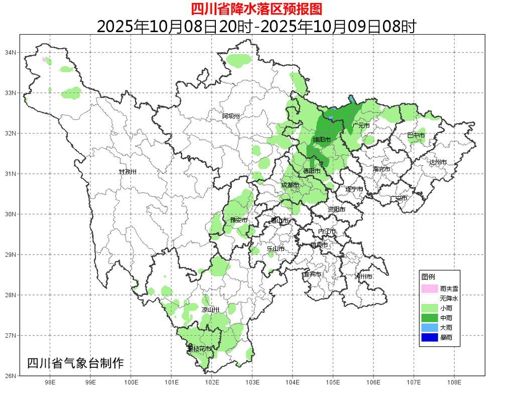 四川省气象台预计,今天(10月8日)晚上到11日白天,盆地西部、北部多阵雨或雷雨,11日部分地方有中到大雨,局地暴雨;川西高原和攀西地区多分散阵雨或雷雨。
