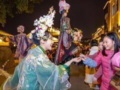 自贡网视频/白可 自贡融媒记者 叶卫东 实习生 白可 2月18日,自流井老街热闹非凡,“逐光艺术生活季”活动正式如火如荼举行。此次活动由室内IP大展、新春戏剧嘉年华、户外公共艺术装置展三个部分组成,当天共吸引客流五万人次。 扁舟一叶,老街熙熙攘攘 记者 叶卫东 摄灵动表演引得游客驻足观看 记者 叶卫东 摄花神游街表演者向观众传递新春之花 记者 叶卫东 摄全体演艺人员同观众合影
