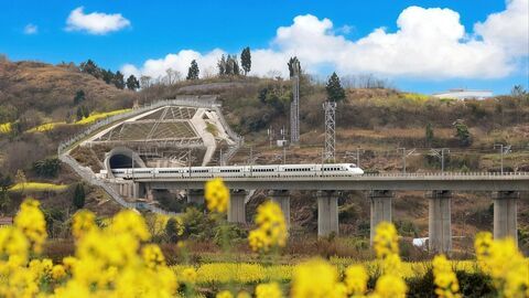 自贡网自贡融媒记者 曾涛 三月,自贡市大安区三多寨镇轿子村的千亩油菜花盛开。成自宜高铁的特大桥横跨山谷,桥下金黄一片,铺成了一幅巨大的花毯。春风拂过,花浪翻涌,空气里弥漫着淡淡的甜香。高铁穿过油菜花田 记者 曾涛 摄美丽的春日画卷 记者 曾涛 摄一列白色高铁从远处驶来,悄无声息地滑上大桥。阳光下,列车如一道流动的光,穿行于花海之上。桥下的水塘里,列车与花田同时倒映水中,仿佛春天特意为这趟列车准备了一面镜