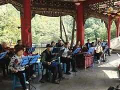 自贡网自贡融媒记者 周姝 文/图 4月24日,自贡彩灯公园的风雨长廊内,丝竹声声,红歌嘹亮。来自自流井区新华乐团的近20名成员拿起各自的乐器,共同奏响经典曲目《珊瑚颂》,悠扬而激昂的旋律吸引了众多过往市民驻足聆听、跟唱。这并非一场临时起意的表演,而是一群退休老人用热爱与坚守,自发书写了十余年的“文化自觉”实践。这支乐团由退休群众自发组建,至今已在风雨长廊扎根超过十年。乐团负责人王利英介绍,目前乐团固定成
