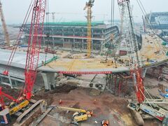 自贡网自贡网记者 李秋玥5月21日上午11时,经过两台履带吊约2小时整体吊装,中铁建工集团自贡站配套设施项目高架桥第四联最后一跨钢箱梁顺利合拢,标志着绵泸高铁内自泸段自贡站配套设施建设取得突破性进展,站前高架桥已全部贯通。“高架桥钢箱梁段分为第三联和第四联,总计长度为280.58米,采用分段进行拼装。本次吊装钢箱梁为圆弧段,总体重量148吨。”据现场施工人员介绍,站前高架道路主体完工,加快了市政道路施工