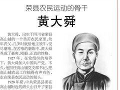 自贡网图:2011年6月7日《自贡日报》第一版黄大舜,出生于四川省荣县高山铺的一个贫苦农民家里,幼年丧父,几岁时就给地主放牛,受尽磨难。在苦难的磨炼中,黄大舜养成了豪爽、刚毅、正直的性格。1927年,在党组织的培养下,黄大舜加入中国共产党。不久,他担任高山铺党支部书记,把高山铺农运工作搞得有声有色,走在荣县农民运动的前头。1928年夏,中共荣县县委在高山铺附近的破头山召开了荣县农民代表大会,到会的400