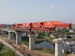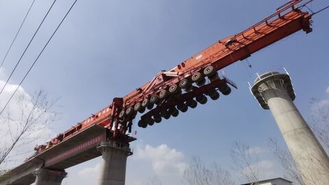 自贡网自贡网记者 张翠娜3月23日, 在川南城际铁路自宜段釜溪河双线特大桥简支梁架设现场,经过近2个小时的施工准备,随着一榀长32米、重900吨的钢筋混凝土标准跨度双线简支梁精准架设在桥梁支座上,标志着四川省境内首条350公里时速高铁自贡至宜宾段首榀箱梁顺利架设成功,吹响了自宜高铁上部结构快速施工的号角,建设进入全面提速阶段。此次箱梁架设采用运架一体化设备架梁,在中铁北京工程局是首次试行,运架过程中无成