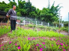 自贡网大安区何市镇永太村1组村道旁,陈先贵家曾经的副食品小店摇身一变成为“开满鲜花的小路”。做生意十多年的陈家,大胆转型,返璞归真,在清新田园里自得其乐。推开崭新的黑条铁门,淡绿色墙砖衬托洁净的院落全景。香菜、葱子、魔芋、海椒、红苕、玉米、花生……门前近半亩的菜园子几乎让老陈家的餐桌“样样有”。媳妇抱着刚诞下的双胞胎踱步哄觉,老伴系着白色围裙忙里忙外。倚山修建的灰墙新房前,大大小小的衣服挂了几杆子,屋后