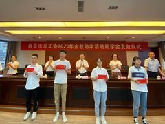 自贡网自贡网讯(记者 池莉)每年金秋时节都有一批莘莘学子迈入新的校园,10日上午,市总工会举行了“2020年市总工会金秋助学活动助学金发放仪式”。30名受助学生代表现场领取了助学金,其余受助学生的助学金将通过银行转账方式发放。据了解,今年市总工会陆续实施了“圆梦工程”“金秋助学”等助学项目,筹资130万元资助贫困中小学生、大学新生1100人,其中大学新生430人、发放助学金92.6万元,追踪帮扶在读大学