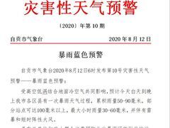 自贡网自贡市气象台2020年8月12日6时发布第10号灾害性天气预警——暴雨蓝色预警:受高空低涡结合地面冷空气共同影响,预计今天白天到晚上我市各区县有一次暴雨天气过程,累积雨量50-90毫米,部分站点可达100毫米以上,最大小时雨量30-60毫米,并伴有雷暴和短时阵性大风。自贡市气象台提醒,广大群众注意防范此次暴雨可能引发的地质灾害、城市内涝及大风带来的危害。(记者 马莉莎)
