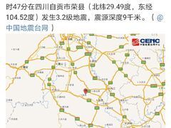 自贡网自贡网讯(记者 陈翠)据中国地震台网正式测定,6月11日7时47分,四川自贡市荣县发生3.2级地震,震源深度9千米,震中位于北纬29.49度,东经104.52度。