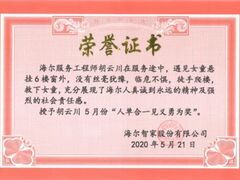 自贡市教育体育局5月21日上午,自贡市富顺县海尔成套服务工程师胡云川徒手爬楼,救下悬在六楼窗户外的女童。为弘扬其见义勇为精神、传递正能量,海尔智家做出嘉奖决定:一、 授予胡云川“人单合一见义勇为奖”。二、 奖励胡云川价值60万元的房产一套。海尔认为,企业即人,人是企业最宝贵的资产。我们不希望看到危险的事情发生,但社会有需要时,希望每一位海尔人都能挺身而出。