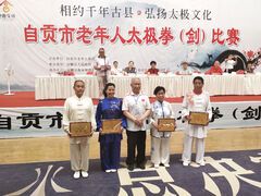 自贡网5月19日下午,自贡市老年人太极拳(剑)比赛经过两天激烈的角逐,在富顺县文体中心完闭幕。市老年人体育协会主席高先敏,市老年人体育协会原荣誉主席刘复洋 ,县委副书记万春霞出席开幕式,并为获奖选手和团队颁奖。本次比赛为期两天,分别设置了集体项目和个人项目。来自全市四区两县14支代表队纷纷亮相,参赛选手们精神抖擞迈步上场,伴随着舒缓的乐曲声,每个人神情专注、怡然自得,一招一式,潇洒飘逸,刚柔并济,充分表