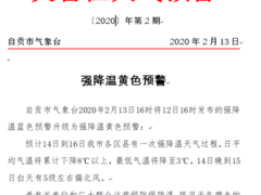 自贡网自贡市气象台2020年2月12日16时发布第1号灾害性天气预警——强降温蓝色预警:预计14日到16日我市各区县有一次降温天气过程,日平均气温将累计下降6℃左右,最高气温从目前的19℃降至7℃,最低气温从8℃降至3℃,冷空气影响时有5-6级偏北风。希有关单位和广大群众注意预防强降温、阵风天气带来的不利影响,根据天气变化适时增加衣物,预防感冒。