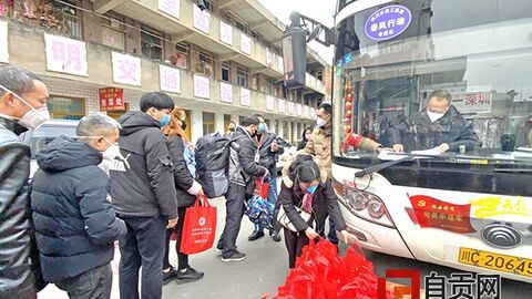 自贡网自贡网讯(记者 李小华)2月5日上午8点40分,省汽运集团公司荣县南客运站超长线发车点,华益公司两辆挂着自贡—深圳线路牌的大巴车披红挂彩待发,63名农民工将乘车前往深圳市务工企业返岗工作。这是我市当天启动“春风行动”首发的第一批次“四川农民工返岗专用车”。据悉,全市各区县乡镇村(社区)正登记农民工出行需求,集中把农民工“点对点、门对门”安全地送到工作单位。“宋晓春来没有……”戴口罩、手持体温检测仪