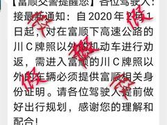 自贡网自贡网讯(记者 叶艳 李秋玥)2月2日,记者从市公安局交警支队获悉,于2日流传的“【富顺交警提醒您】各位驾驶人,接最新通知:自2020年2月1日起,对在富顺下高速公路的川C牌照以外的机动车进行劝返,需进入富顺的川C牌照以外的车辆必须提供富顺相关身份证明。请各位驾驶人提前做好出行规划,感谢您的理解和配合!”情况不属实,系假消息。 目前确在高速路出口设置了管控点,