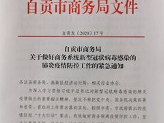 自贡网讯(记者 欧亚非)1月29日上午,市商务局对标市委市政府“十大行动”要求,结合商务工作实际,向各区县和相关行业协会印发了《关于做好商务系统新型冠状病毒感染的肺炎疫情防控工作的紧急通知》,重点抓好“五停止五保障”,全力推进疫情防控工作。 据介绍,“五停止”即停止群体性聚餐聚会、停止各类经贸(展会)活动、停止流通市场活