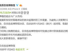 自贡市盐业历史博物馆24日上午,自贡恐龙博物馆在微博发布闭馆公告称,为避免人员聚集引发交叉感染,自2020年1月24日(除夕)起闭馆。已经网上购票的观众,自贡恐龙博物馆将尽快通过原付款渠道退还票款。