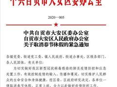 综合网络据自贡大安区委区政府消息,为切实做好大安区新型冠状病毒感染的肺炎疫情防控和应急处置工作,有效控制疫情的输入、传播和蔓延,切实维护人民群众的生命安全和身体健康,经大安区委区政府研究决定,各单位一律取消春节休假,正常上班,全力以赴做好疫情防控工作。