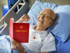 自贡网自贡融媒记者 芶思 摄影报道 “我志愿加入中国共产党……随时准备为党和人民牺牲一切,永不叛党。”7月1日上午,在自贡市第四人民医院檀木林院区脊柱与创伤外科20号病床上,自贡市离休干部、100岁老人蔡信孚用稍显迟缓的动作,将党员徽章佩戴在胸前,熟练地翻开《中国共产党章程》至28页。他右手握拳举起,用略带沙哑的声音重温了入党誓词。去年5月14日,蔡信孚光荣地成为了一名中共预备党员,今年已按期转为中共正