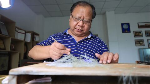 自贡网张熠/视频 自贡融媒记者 王汉卿 叶卫东 实习生 白可 刘佳 晨雾如纱,轻柔地笼罩着川南的竹林。63岁的龚道勇踏着晨露,缓步走入这片绿意深处,脚步惊起了几只早起的鸟儿。他指尖抚过青青竹节,仿佛在弹奏一曲无声的乐章。“每一根竹子,都在等待懂它的人。”他微笑着说,“就像这幅龚扇《飞天》,也在等待最合适的竹丝,来成就她飘逸的舞姿。” 龚道勇开始制作龚扇 记者 叶卫东 摄 梳理竹丝 记者 叶卫