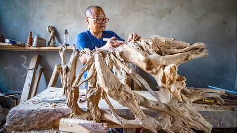 自贡网自贡融媒记者 王汉卿 叶卫东 张熠 实习生 白可 刘佳 一块天生扭曲的乌木,一把染满岁月斑驳的刻刀,一双布满老茧却极稳的手——在林本德的工作室里,时间仿佛被按下了暂停键,唯有木屑如细雪般簌簌飘落。他俯身案前,心神凝聚于正在雕刻的仕女像之中。刀尖轻盈游走,树根天然的曲度渐渐化作女子婀娜的体态,微绾的发髻、翩然的衣袂,仿佛再有一瞬,她便要从沉木中款步走出。 雕刻仕女像 记者 叶卫东 摄