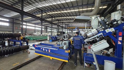 自贡网自贡融媒记者 池莉 文/图 4月8日,记者走进位于沿滩工业园区的四川易霖诚泰新材料有限公司看到,原料车间内,新型高分子改性聚烯烃颗粒被精准投送;生产线上,钢带过塑、原料搅拌、钢带成型、电容加热……一道道自动化工序环环相扣,精准运行。最终,一根根口径各异、结构精密的管道在成品库整齐码放,等待着发往各地的建设项目。从原料入口到成品出口,车间内机械臂挥舞,自动化输送带流转不息。机器轰鸣声中,涌动着的是易
