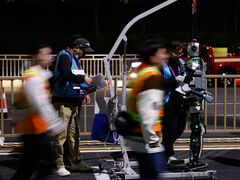 新华社4月11日晚至4月12日凌晨 2026北京亦庄人形机器人半程马拉松 全流程全要素测试活动在北京经开区举行 4月11日,工作人员在测试活动前做准备。新华社记者 王丽莉 摄 4月12日凌晨,操作人员在调试一台参加全要素测试的机器人。新华社发(翟一凡摄) 4月11日,工作人员在测试活动中为一台机器人更换电池。新华社记者 王丽莉 摄 4月11日,一台机器人在测试活动中奔跑。 新华社记者 王丽莉 摄 活动全