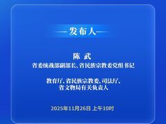 四川法治报2025年11月26日(星期三)10:00,省政府新闻办将在四川新闻发布厅举行“决胜‘十四五’ 续写新篇章”系列主题新闻发布会第十五场,省委统战部副部长、省民族宗教委党组书记陈武围绕四川“十四五”时期民族宗教工作主要成就作介绍,教育厅、省民族宗教委、司法厅、省文物局有关负责人参加答记者问。四川发布客户端将全程图文直播,敬请关注! 点此进入直播
