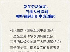 央视网中新网3月18日电 发生劳动争议,当事人可以到哪些调解组织申请调解?人社部3月18日通过官方微信公众号作出解答。具体如下: 可以去以下调解组织申请调解: 一是企业劳动争议调解委员会; 二是依法设立的基层人民调解组织; 三是在乡镇、街道设立的具有劳动争议调解职能的组织。 图片来源:人力资源社会保障部微信公众号