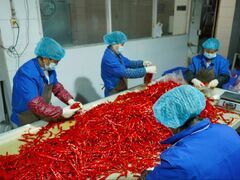 12月16日上午9点,资阳市乐至县中天镇的空气里,咸鲜味弥漫——这是小镇独有的“呼吸”。在川龙酿造食品有限公司的生产车间内,穿着蓝色工服、防护帽与口罩的工人们正围在操作台旁,分拣装袋那堆得像小山似的腌制红辣椒。这些辣椒刚完成属于它们的风味“修行”,即将送往消费者们的餐桌。 川龙酿造食品有限公司的生产车间内工人正在分装辣椒。受访者供图作为仅次于成都市郫都区、眉山市的全省重要酿造食品生产基地之一,中天