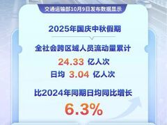 交通运输部10月9日发布数据显示 2025年国庆中秋假期 全社会跨区域人员流动量累计24.33亿人次 日均3.04亿人次 比2024年同期日均同比增长6.3% 创历史新高 小团游、自驾游、亲子游等出行需求旺盛 假期交通出行火热 记者:叶昊鸣 海报制作:吴彬尔 新华社国内部出品
