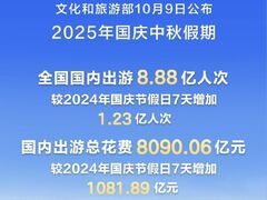 新华社文化和旅游部10月9日公布2025年国庆中秋假期文化和旅游市场情况。经测算,假日8天,全国国内出游8.88亿人次,较2024年国庆节假日7天增加1.23亿人次;国内出游总花费8090.06亿元,较2024年国庆节假日7天增加1081.89亿元。 假期中,群众情怀激荡,竞相出游。人们升国旗、唱红歌;赏秋景,庆团圆;传统文化焕发活力,国潮非遗出新出彩,景区“宠客”蔚然成风。文旅消费热力十足,人文经济共