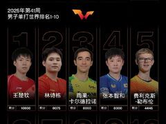 央视网今天,国际乒联第41周世界排名出炉。 男子单打,中国队球员王楚钦、林诗栋位列前二,梁靖崑位列第七,向鹏位列第九。 WTT中国大满贯男单亚军费利克斯·勒布伦排名上升2个名次位列第5;八强宇田幸矢排名上升7个名次位列第26;八强陈俊菘排名上升67个名次位列第46,刷新个人职业生涯排名新高;十六强弗拉芬·科顿排名上升9个名次位列第43,刷新个人职业生涯排名新高;十六强爱德华·约内斯库排名上升24个名次位