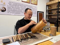 眉山市融媒体中心冬日午后,阳光终于穿透连日阴雨,洒在黄建位于泸州市纳溪区滨江路的竹雕工作室门前。他正端坐案前,手中雕刀在竹筒上细细游走,竹屑如碎玉般簌簌落下。这一幕,引得来滨江路散步的市民纷纷驻足,探头好奇地询问:“这刻的啥子?好精致哦!” 作为省级非遗纳溪竹雕的第五代传承人,黄建与竹刀为伴已有15个年头。可即便在泸州本地,这门手艺仍透着股“神秘感”。“我师父做了30多年竹雕,连隔壁邻居都搞不清他天天关着门在忙啥