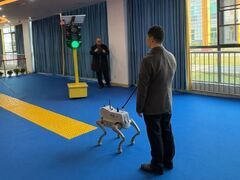 资阳观察一只机器导盲犬在接受到指令后,带着身后扶着连接杆的视力残疾人吴军,缓步走上舞台。待吴军发言完毕,机器导盲犬又引领着他安全回到座位。这是12月2日,第34个国际残疾人日来临之际,发生在“科技有爱 共创未来”2025国际残疾人日主题助残活动上的一幕。 “启明一号”带着吴军通过模拟红绿灯记者获悉,机器导盲犬由绵阳科技城新区的企业五八机器人联合成都触乾科技共同研发,是四川首款智能机器导盲犬,名叫“启明一号