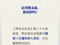 央视新闻客户端中新网10月30日电 试用期未满能离职吗?人社部10月30日通过官方微信公众号作出解答。 《劳动合同法》第三十七条规定,劳动者在试用期内提前三日通知用人单位,可以解除劳动合同。 图片来源:人力资源和社会保障部微信公众号