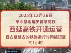 新华社12月26日上午,随着首趟“复兴号”智能动车组列车驶出延安站,西安至延安高速铁路正式开通运营,革命圣地延安进入“高铁时代”。 西延高铁2021年5月开工建设,是我国“八纵八横”高铁网包头、银川至海口的包(银)海通道的重要组成部分,全长299公里,设计时速350公里。线路经陕西西安、渭南、铜川、延安四市,此次开通10座车站。高铁开通后,西安至延安的铁路运行时间由2个多小时缩短至约1小时。 西延高铁经