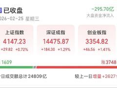 中国铁路川观新闻记者 李菲菲 2月25日,A股三大指数集体上涨。截至收盘,沪指涨0.72%,收报4147.23点;深证成指涨1.29%,收报14475.87点;创业板指涨1.41%,收报3354.82点。 同花顺App截图 春节后市场热点有序轮动,交投情绪持续升温——今日全市场成交额达24809亿元,较上一交易日放量2627亿元;全市场超3700只个股上涨,投资者赚钱效应显著回升。 今日盘面上,化工行业
