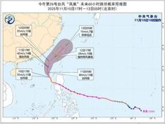 央视新闻客户端中央气象台11月10日18时继续发布台风黄色预警: 今年第26号台风“凤凰”的中心今天(10日)下午5点钟位于台湾岛鹅銮鼻南偏西方约500公里的南海中东部海面上,就是北纬17.9度、东经118.7度,中心附近最大风力有12级(35米/秒),中心最低气压为970百帕,七级风圈半径380-480公里,十级风圈半径180-220公里,十二级风圈半径80公里。 预计,“凤凰”将以每小时10-15公里的速度