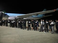 央视新闻客户端新华社北京10月21日电韩国外交部长官赵显20日说,柬埔寨向韩国遣返64名涉嫌参与网络诈骗的韩国籍嫌疑人后,在一场行动中又逮捕10余名涉案韩国人,另有两名据信被犯罪团伙拘禁的韩国人获救。 赵显当天在一场记者会上说,柬埔寨警方16日对电诈犯罪窝点开展打击行动,被捕和获救的韩国公民预计本周返回韩国。 10月18日凌晨,在柬埔寨金边德崇国际机场,警察押送被遣返的韩国网络诈骗嫌疑人登机。新华社/柬新社他同