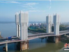 中新网武汉10月31日电 (卢琪 蒲凯伦 余思思)华中地区首座开启桥——武汉右岸大道开启桥10月31日进入试通车阶段。该桥提升长度、宽度、高度、重量均为同类型开启桥亚洲第一。 图为位于武汉市青山区的右岸大道开启桥。(无人机照片)涂宇轩 摄右岸大道开启桥位于武汉市青山区武钢工业港,桥梁全长737米,桥梁可升降部分全长104米,塔柱断面最宽处46.2米,最大可提升27米,提升重量2650吨,由长江设计