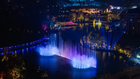 自贡融媒记者 宋姿熠 视频/宋姿熠 夜幕低垂,自贡市沿滩新城龙湖公园化作一幅流动的光影画卷。智能音乐喷泉随旋律起舞,水柱时而如银柱擎天,时而似轻纱曼舞,在全彩激光与水幕电影技术的映衬下,勾勒出“一曲一景、一时一韵”的视觉奇观。灯柱与湖畔盐文化主题灯组交相辉映,盐井天车、歪脑壳船等历史元素在光影中焕发新生,倒影如梦如幻,仿佛将人带回千年的盐都记忆。这场融合“声、光、水、影”的沉浸式盛宴,不仅点亮了