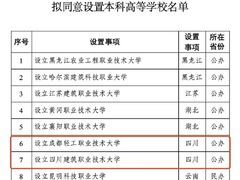 川观新闻川观新闻记者 江芸涵 1月12日,教育部网站发布公示,教育部拟同意设置14所本科高等学校。其中,四川有2所,分别为成都轻工职业技术大学和四川建筑职业技术大学。 根据《中华人民共和国高等教育法》《普通高等学校设置暂行条例》《普通本科学校设置暂行规定》《本科层次职业学校设置标准(试行)》等有关规定,经教育部党组会议审议,拟同意设置黑龙江农业工程职业技术大学等14所学校并予以公示,公示时间为2026年1