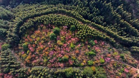 荣县融媒体中心徐振宇 自贡融媒记者 王梓薇 文/图 时值深冬,自贡荣县铁厂镇大丰村数百亩冬樱花在山顶绚烂绽放,红粉交织的花簇密密匝匝挂满枝头,与周遭苍翠的森林相映成趣,勾勒出一幅浪漫的山乡画卷。这片冬樱花海扎根于独特的穹隆地貌之上,山下是陡峭的悬崖、蜿蜒的高速公路与层叠的茶园。红粉交织的冬樱花与墨绿山林、碧绿茶园、嶙峋崖壁构成一幅层次分明的壮美画卷,在冬日暖阳的映照下更显磅礴气势。 游人们穿梭在花径间,或驻足远