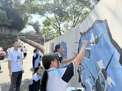 自贡网近日,富顺县城关中学校园内的一排围墙成为一道靓丽的风景线——由师生共同构思、绘制的国防主题墙绘震撼亮相。战机、导弹、航母等国防重器破墙而出,以艺术之美传递国防力量,点燃师生心中的家国情怀。 走进校园,原本单调的白墙,如今化作“生动的国防课堂”:歼击机划破砖墙呼啸而来,导弹发射车从裂缝中冲出,航母在海浪与碎石间破浪而行……这一幅幅墙绘作品以艺术为桥梁,将国防教育自然地融入校园文化。 每一幅作品都是由