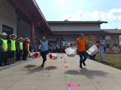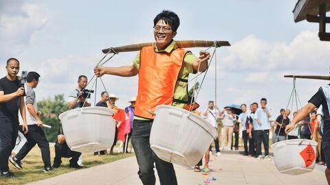 富顺县融媒体中心自贡融媒记者 周嘉 芶思 文/图 秋风送爽,金穗荡漾。9月24日,在富顺县代寺镇丰光村稻香村舍,来自该镇的4个村(社区)的代表队、西湖文旅公司的职工代表队及周边百余名村民汇聚于此,在一场场趣味农耕技能的角逐中共赴一年一度的“丰收之约”。现场,激烈的“粮袋接力”赛精彩上演。随着裁判员一声令下,参赛选手们肩挑5公斤重的粮袋,沿着20米赛道快速奔跑,扁担上的粮袋随着步伐轻轻晃动,展现出新时代农民的矫健身