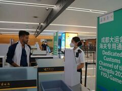 新华社7月21日,来自美国、巴西、阿根廷、法国、南非5个大运会代表团的60余名成员,从成都天府国际机场入境,包括20余名大运会随团官员和40余名运动员,这是在成都海关办结通关手续的首批入境运动员,将参加篮球、乒乓球、跆拳道等赛事角逐。 中午15点28分,巴西代表团成员通过成都大运会海关专用通道,这是成都海关近期升级改造的智能通道,集成了行李检查X光机,涵盖行李分析推送系统,通关人员信息识别、异常告警提示