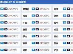 “央视一套”微信公众号今明天(7月13日至14日),四川仍有大范围降雨,盆地雨势较强,局地有暴雨。近期,四川盆地降雨频繁,需警惕叠加降雨的致灾性,公众需关注预警预报信息,尽量避免在暴雨时段出行,注意交通安全。 昨天,四川盆地出现大范围降雨,8时至14时,局地6小时降雨量超50毫米。 四川省气象台预计,今天,盆地各市阴天有阵雨或雷雨,雨量普遍中雨到大雨,其中广元、绵阳、德阳、成都、巴中、南充、雅安、泸州8市的局部地方有暴