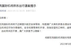 新华社5月11日下午,“成都双流国际机场”官方微信发布提示,成都双流国际机场将于近期提升航空安保等级,特提请广大乘机旅客合理安排出行时间,抵达机场后尽快办理值机、安全检查等乘机手续,到指定登机口候机,避免影响出行行程。全文如下: 成都双流国际机场旅客出行温馨提示 尊敬的各位旅客: 成都双流国际机场将于近期提升航空安保等级,特提请广大乘机旅客合理安排出行时间,抵达机场后尽快办理值机、安全检查等乘机手续,到