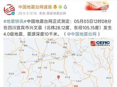 中国地震台网速报中国地震台网正式测定:05月03日12时08分在四川宜宾市兴文县(北纬28.12度,东经105.15度)发生4.0级地震,震源深度10千米。