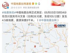 @西南铁路中国地震台网正式测定:05月03日13时04分在四川宜宾市兴文县(北纬28.10度,东经105.12度)发生4.5级地震,震源深度8千米。